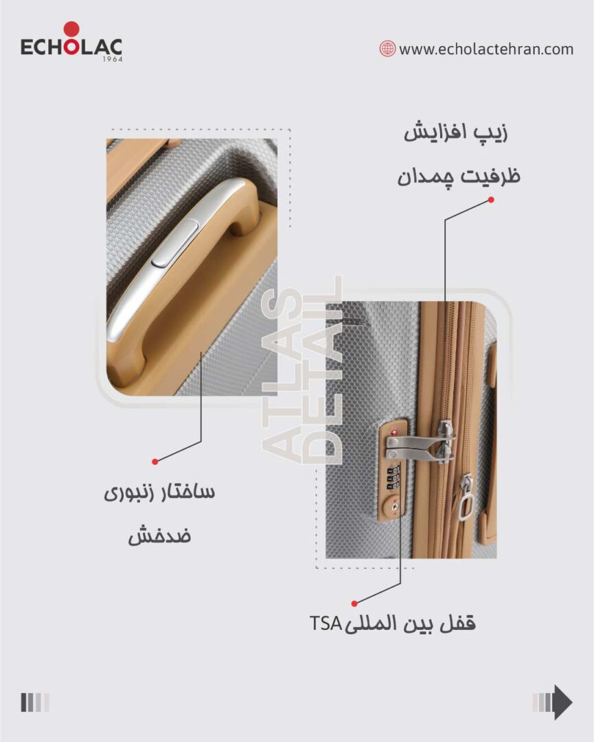 چمدانهای جنس سخت مدل اطلسِ برندِ اکولاک از پلیکربناتِ خالص سه لایه ساخته شده است. بدنه مدل اطلس همانند یک زره از وسایل شما حین سفر محافظت می کند. مهمترین ویژگی مدل اطلس ضدضربه بودن و مقاوم بودنش در برابر انواع خط و خش است.