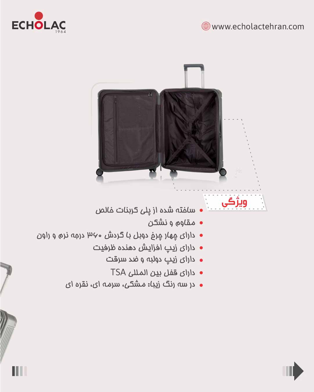این چمدون زیبا و با پرستیژ چهار چرخ روان با گردش ۳۶۰ درجه داره از اون چرخ‌های بی‌صدا و خیلی با کیفیت. مدل نکست ضد سرقت هم هست و هیچ چاقو یا پیچ گوشتی‌ای نمی‌تونه زیپ این چمدون و باز کنه.
