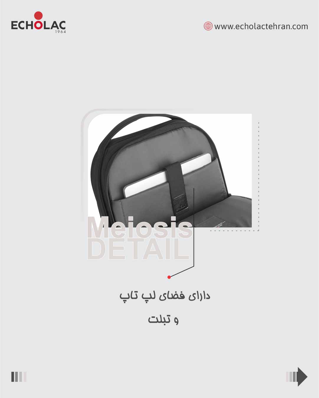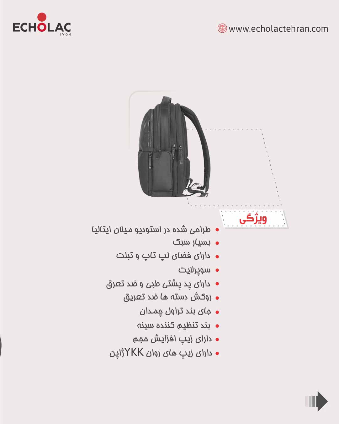 - دارای فضای اختصاصی برای تبلت و لپ تاپ تا 13.3 اینچ