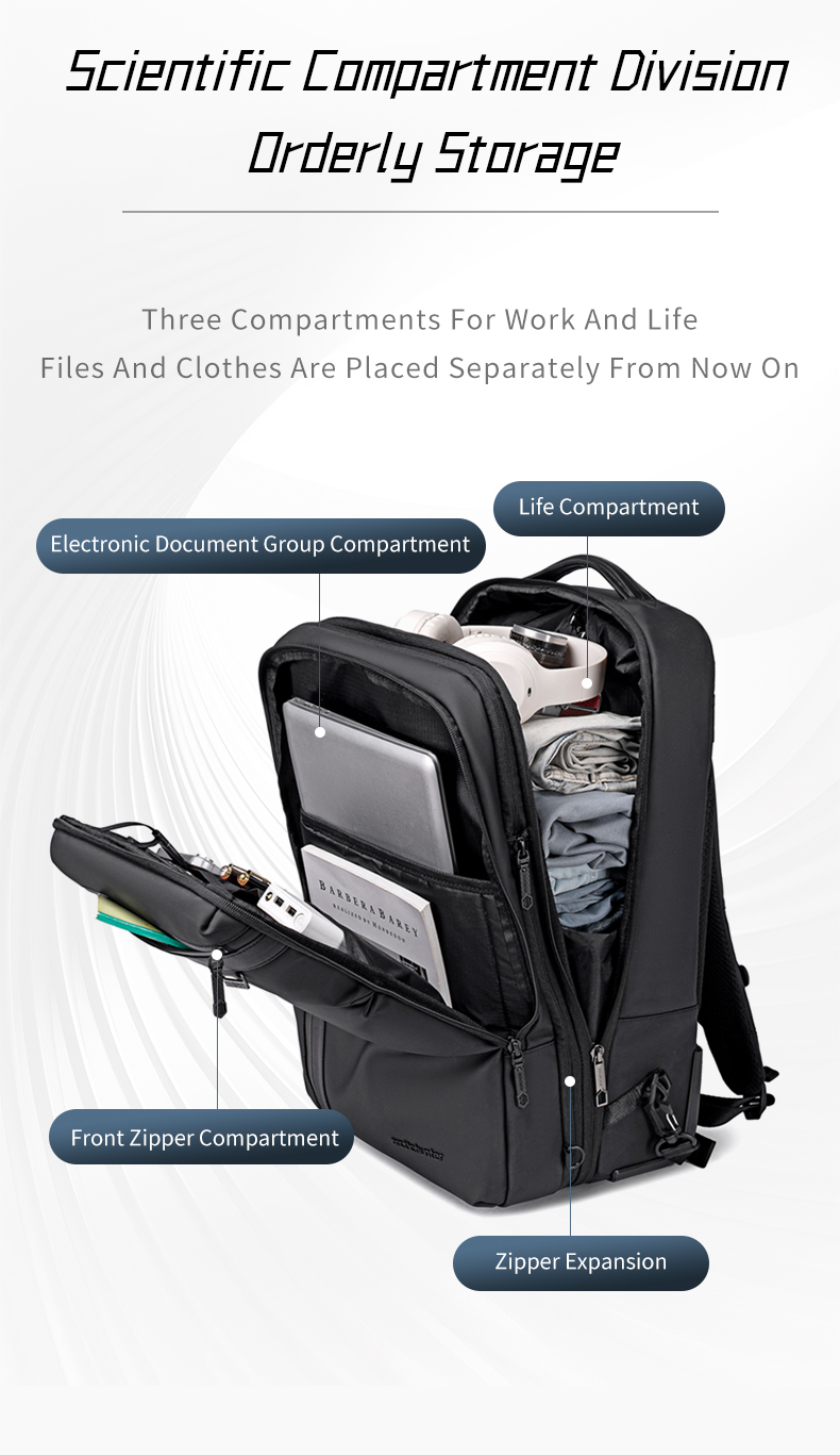 این کیف چرخ‌دار دارای 4 محفظه زیپ‌دار است که برای سازماندهی بهتر لوازم شما طراحی شده‌اند. محفظه اصلی به‌طور کامل باز می‌شود و قابلیت گسترش دارد. همچنین یک محفظه جداگانه برای لپ‌تاپ، از دستگاه شما به‌خوبی محافظت می‌کند.