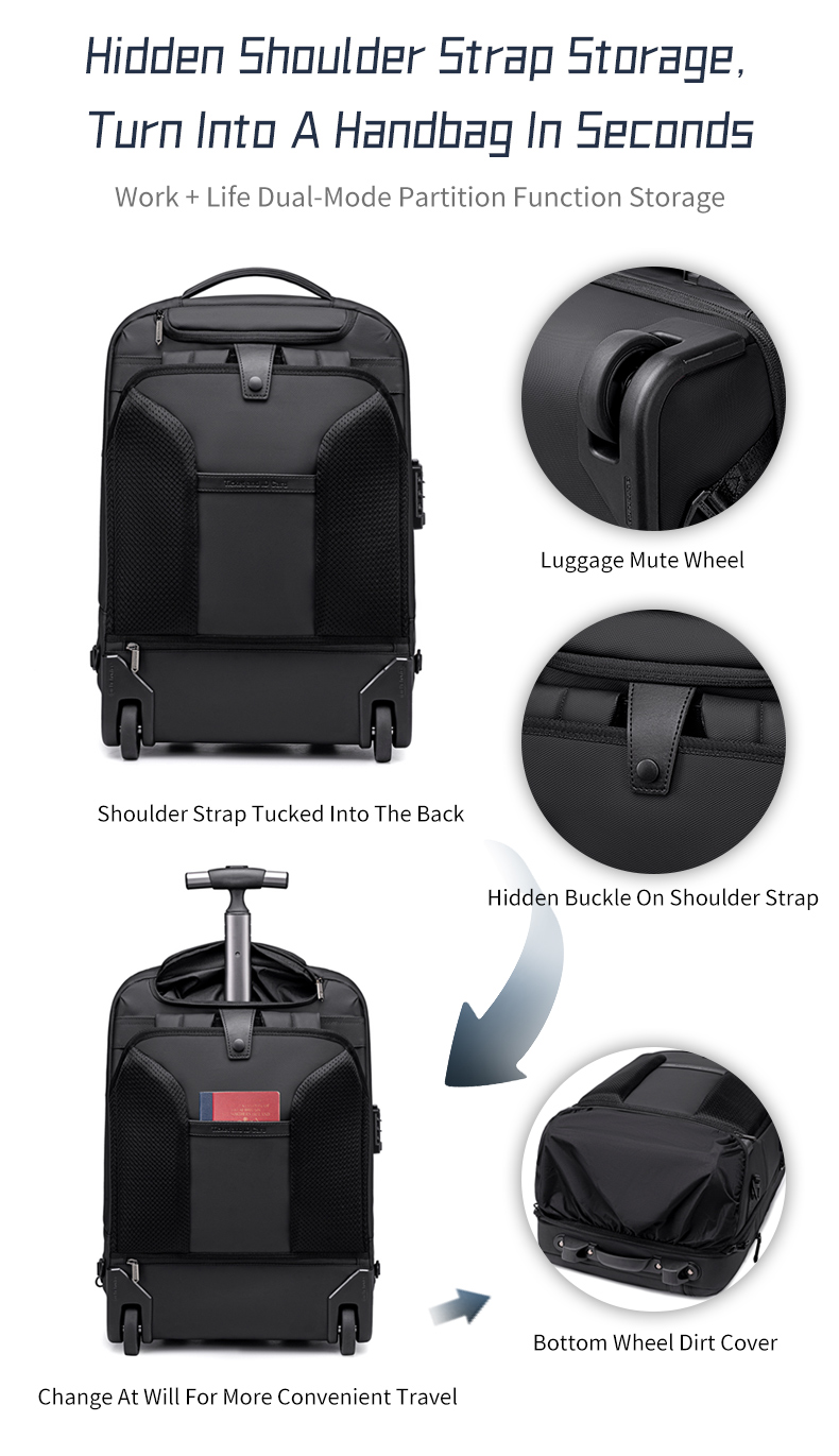 این کیف چندمنظوره به‌عنوان کوله‌پشتی و کیف چرخ‌دار قابل استفاده است و انعطاف‌پذیری و راحتی را در سفر به شما ارائه می‌دهد. دسته چرخ‌دار، بندهای شانه و چرخ‌ها به راحتی قابل مخفی شدن هستند که تجربه استفاده بهتری را فراهم می‌کند.