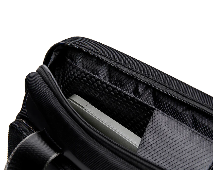 بدنه اصلی کیف از پارچه پلی استر و نایلون مقاوم و قابل تنفس ساخته شده است. قسمت جلویی کیف دارای مقاومت در برابر آب و خش است.